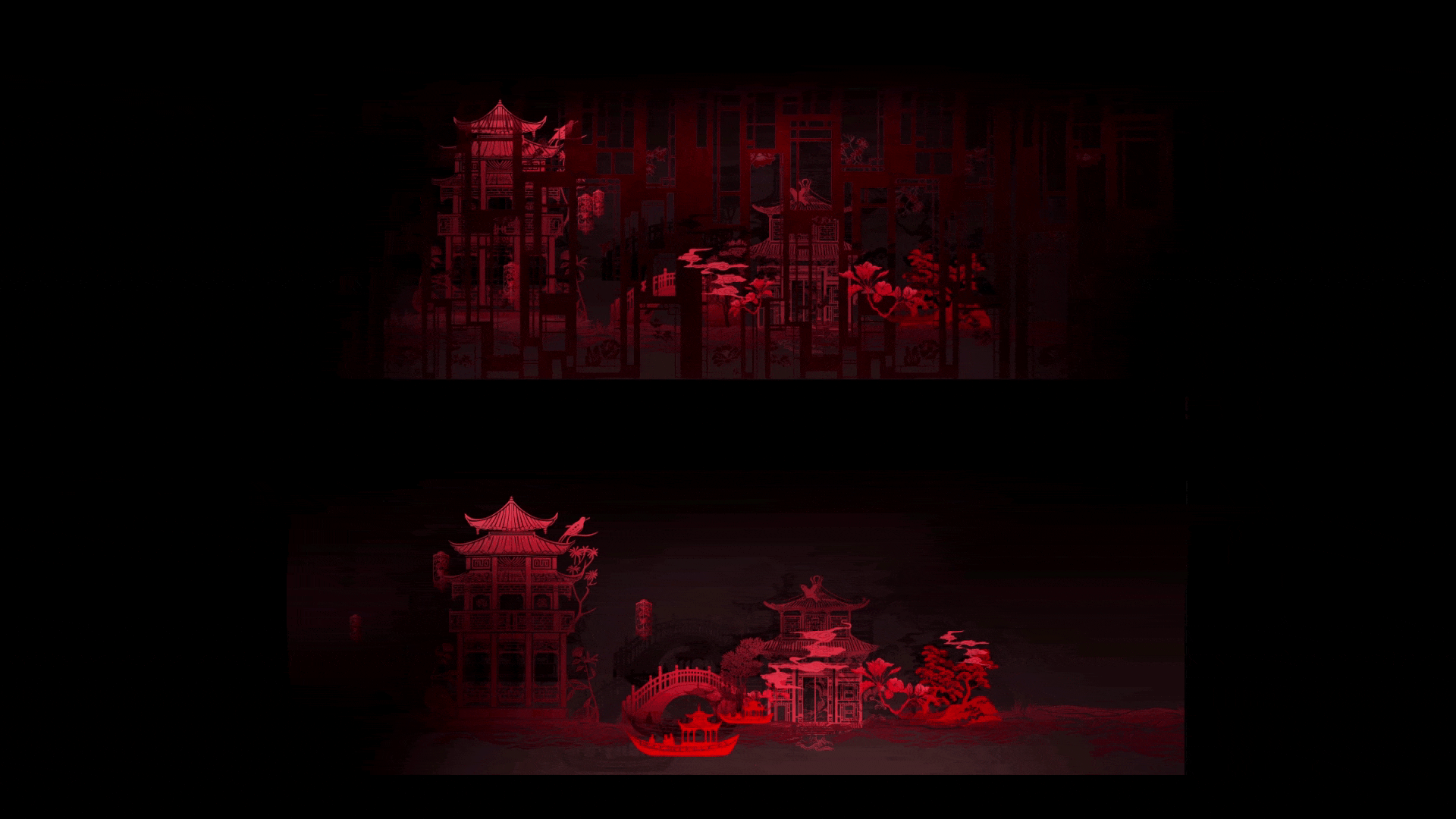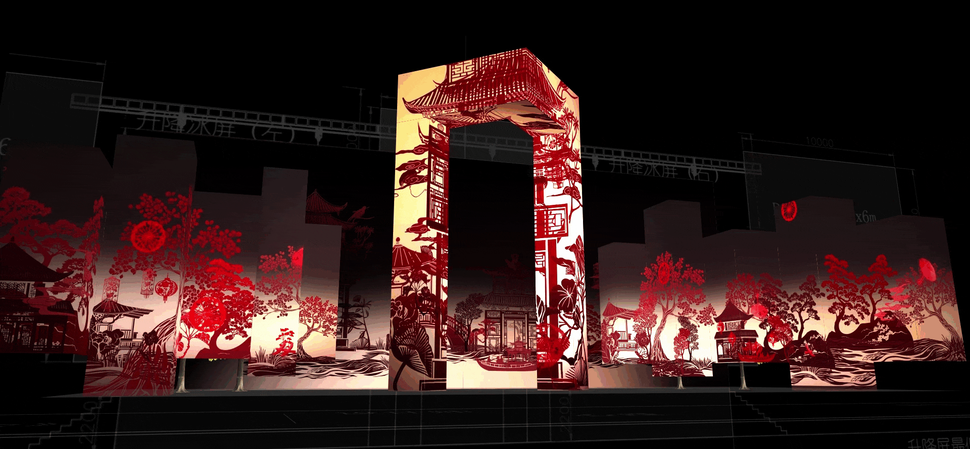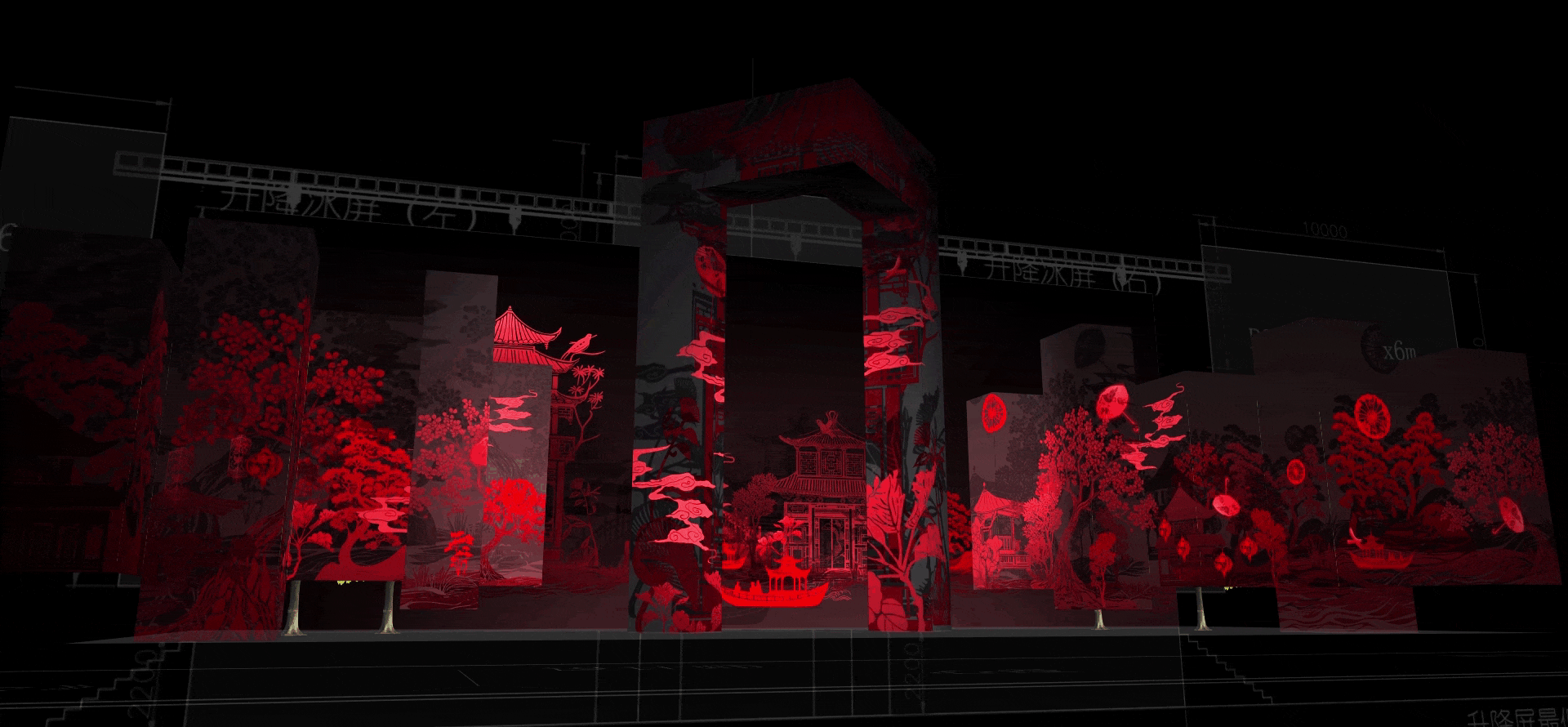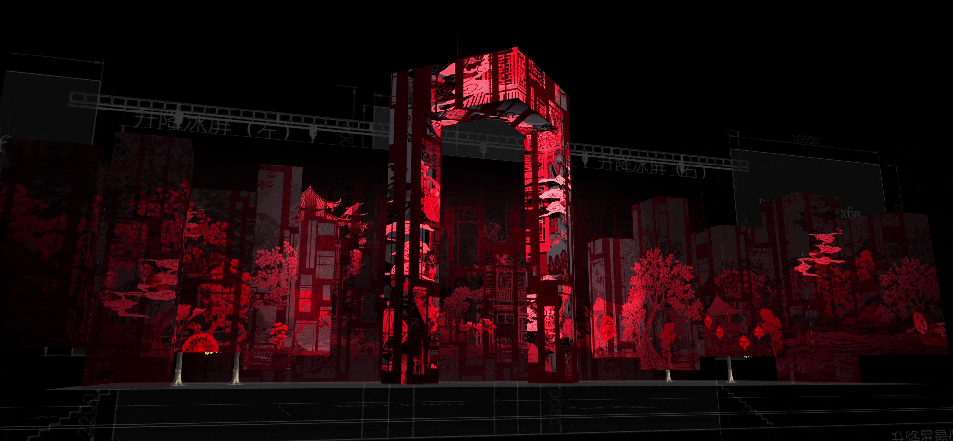 Layered red silhouettes form a flowing stage landscape—trees, pavilions, and rivers—blending classical aesthetics with modern motion to create a poetic, immersive atmosphere.